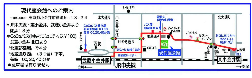 現代座会館 2019年03月27日 <現代座会館>〒184-0003 東京都小金井市緑町5−13−24地蔵通りから私道に入ったところに有ります。CoCoバスなら「地蔵通り西」、北大通りを走るバスなら「小金井北高校」で降りて、ウェルパークか大黒屋の道を南に歩いて5分くらいです。現代座の玄関を入ると、下駄箱が有ります。入っているスリッパに履き替えてお上りください。 「アクセス」カテゴリの最新記事 タグ :#現代座会館#地図 < 前の記事次の記事 >